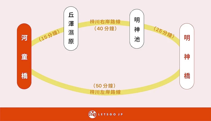 | 3小时行程─B | ・于【上高地巴士总站】下车抵达 *离开时往松本的旅客请先抽整理券 ・路线:【河童桥】→梓川左岸路线→【明神桥】→【明神池】→梓川右岸路线→【岳泽湿原】→【河童桥】 ・从【上高地巴士总站】坐车离开 |