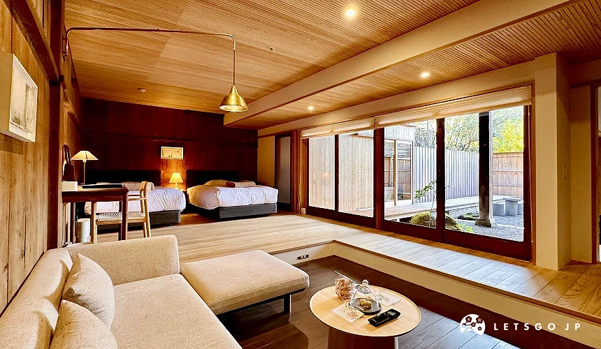 紧邻主园区的「汤之山 素粹居(YUNOYAMA SOSUIKYO)」是一处融合自然素材与艺术设计的极简旅宿。大片落地窗引入森林光影,房内以纸、泥土、石材等元素为主题,打造宁静、纯粹、不受打扰的疗癒住宿空间。每间客房都拥有独特的景致与宽敞配置,像是宽阔的客厅、和室休憩房、柔软的大床与干净俐落的动线,搭配上专属露天温泉池,使入住时的节奏自然慢下来,且不被人打扰。