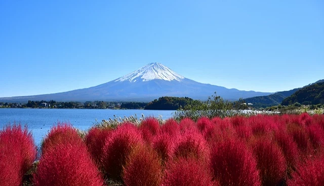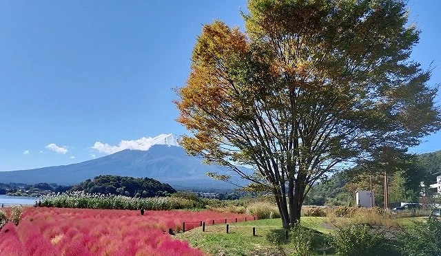 10月的大石公园,整片扫帚草(波波草)逐渐由绿转红,是秋季最受欢迎的打卡美景。到了10月下旬至11月上旬也迎来枫叶季,湖畔步道化身为迷人的红叶回廊,搭配上远方覆雪的白头富士山,构成秋季限定的和风景致。此外,往年11月还会盛大举办「富士河口湖红叶节」,可以欣赏夜间点灯,并在摊位间吃吃喝喝,是赏景兼散策的完美旅游时节。